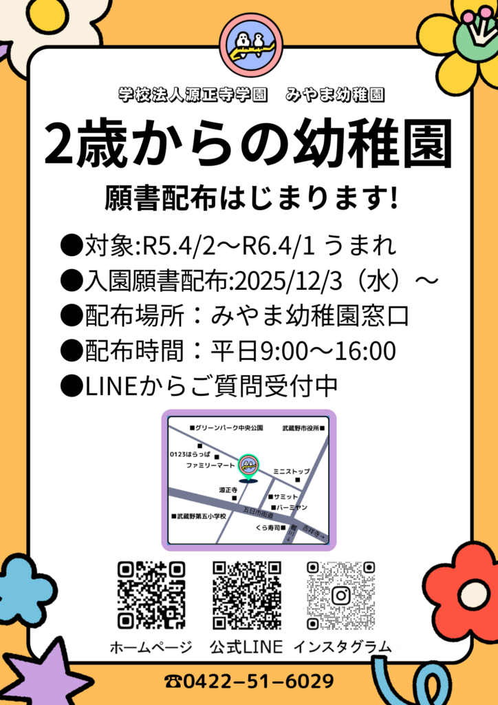 ※ご希望により満3歳の誕生日を待たずに、満3才児クラスの編入も可能です。その場合は、満3歳誕生日月から東京都及び区市からの補助金で保育料31,500円が免除になります。9時登園~13時30分降園となり、その時間以降、ご希望によって15時迄お預かり保育をお受けしています。 (オムツで大丈夫です◎)また、平日9:30~12:00の間、あそびの広場を開放していますので、自由にご利用いただけます。 3歳までの未就園のお子さんでしたらどなたでもご利用いただけますので、ぜひご活用ください✨(※みやまルーム、園イベント実施日はあそびの広場の親子利用不可)
